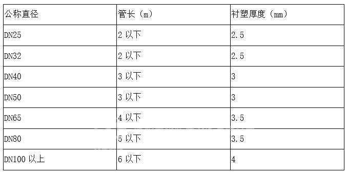 注:1.為保障管徑襯塑后符合工藝要求,DN65以下管道內口徑應大于原設計6-10mm。